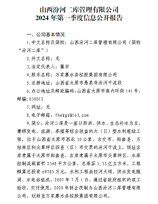 山西水控實業有限公司2024年第一季度信息公開報告