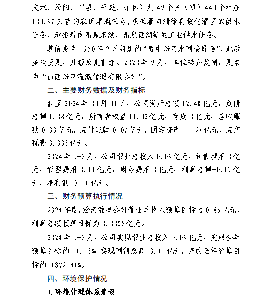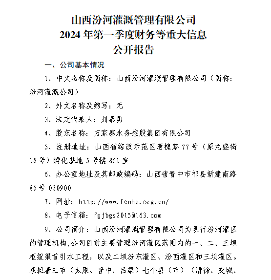 山西萬家寨引黃水務集團有限公司2024年第一季度信...