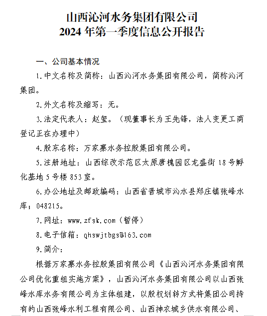 山西滹沱河管理有限公司2024年第一季度信息公開報...
