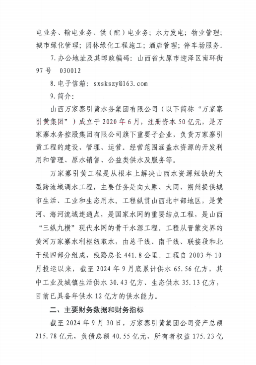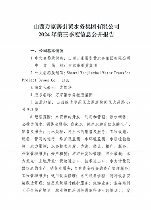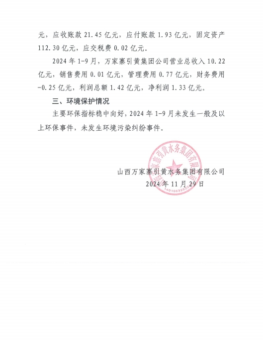 山西萬家寨水控工程投資有限公司2024年第三季度信...