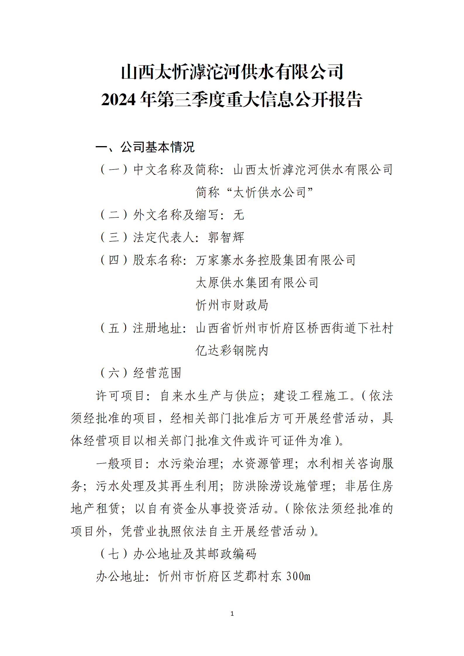 山西水務集團建設投資有限公司2024年第三季度信息...